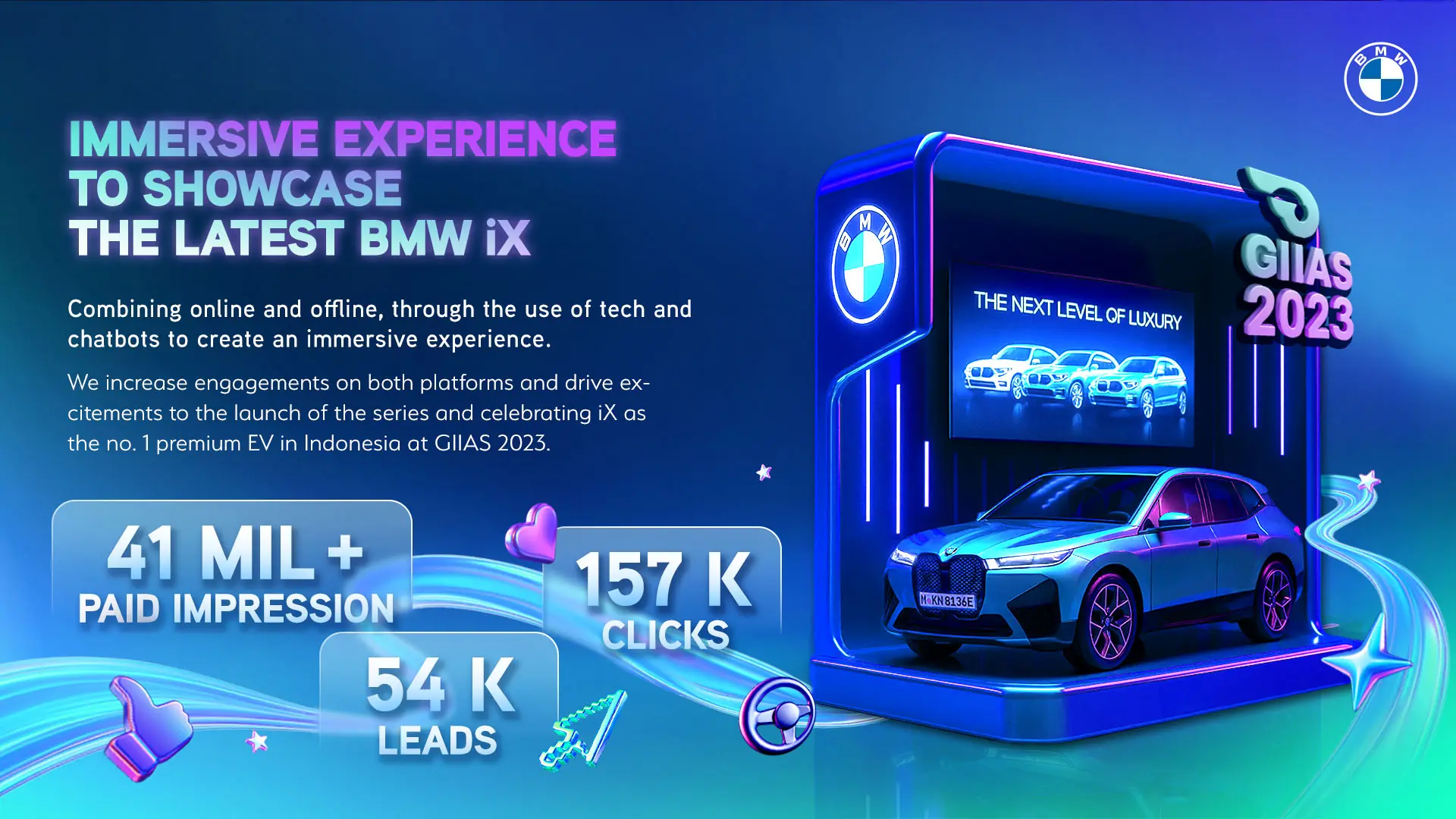 Combining online and offline experiences, through the use of tech and chatbots. We increase engagements on both platforms and drive excitements to the launch of the series and celebrating iX as the no. 1 premium EV in Indonesia.